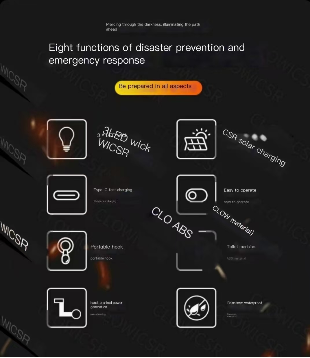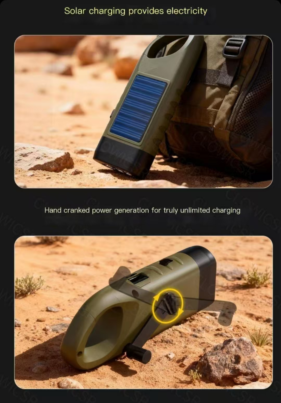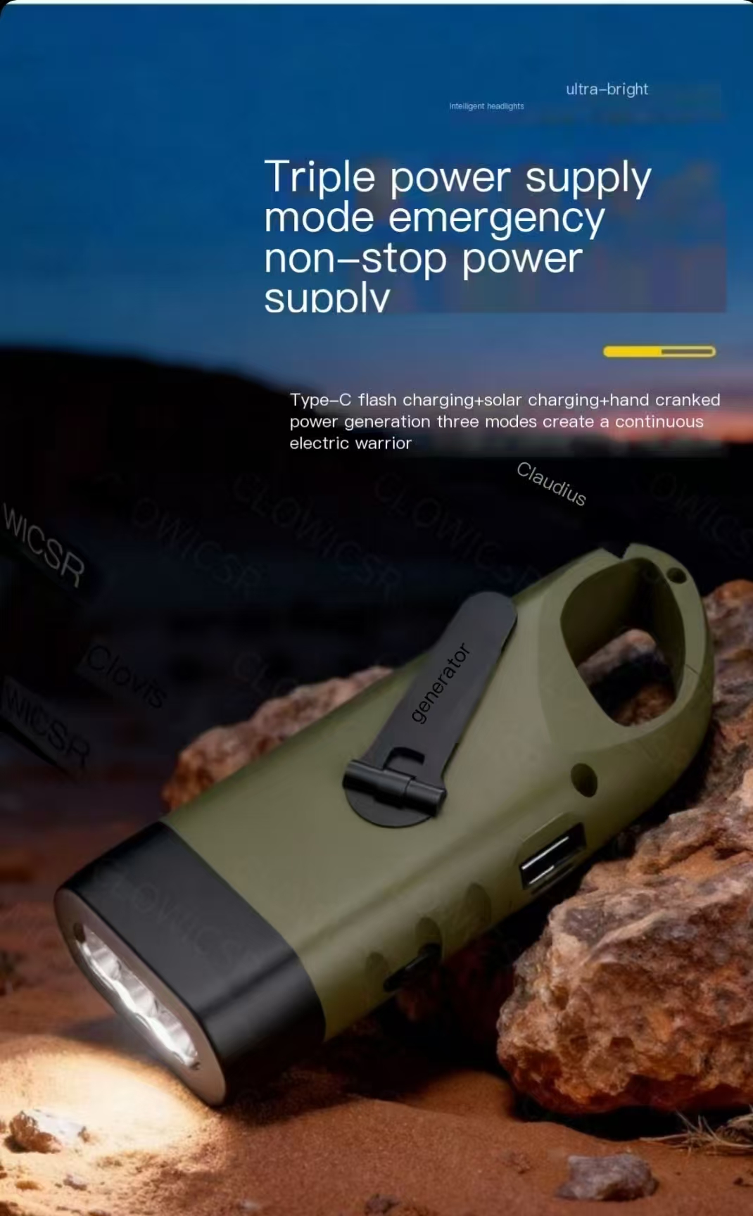 Solar-powered, hand-cranked, rechargeable triple power supply, multifunctional with strong lighting, SOS distress signal, and emergency charging. Compact and portable, waterproof and shockproof, suitable for camping and adventure, home emergencies, and disaster preparedness. Can be charged with sunlight, never goes out when hand-cranked, illuminates safety in critical moments, protecting every trip and home security.