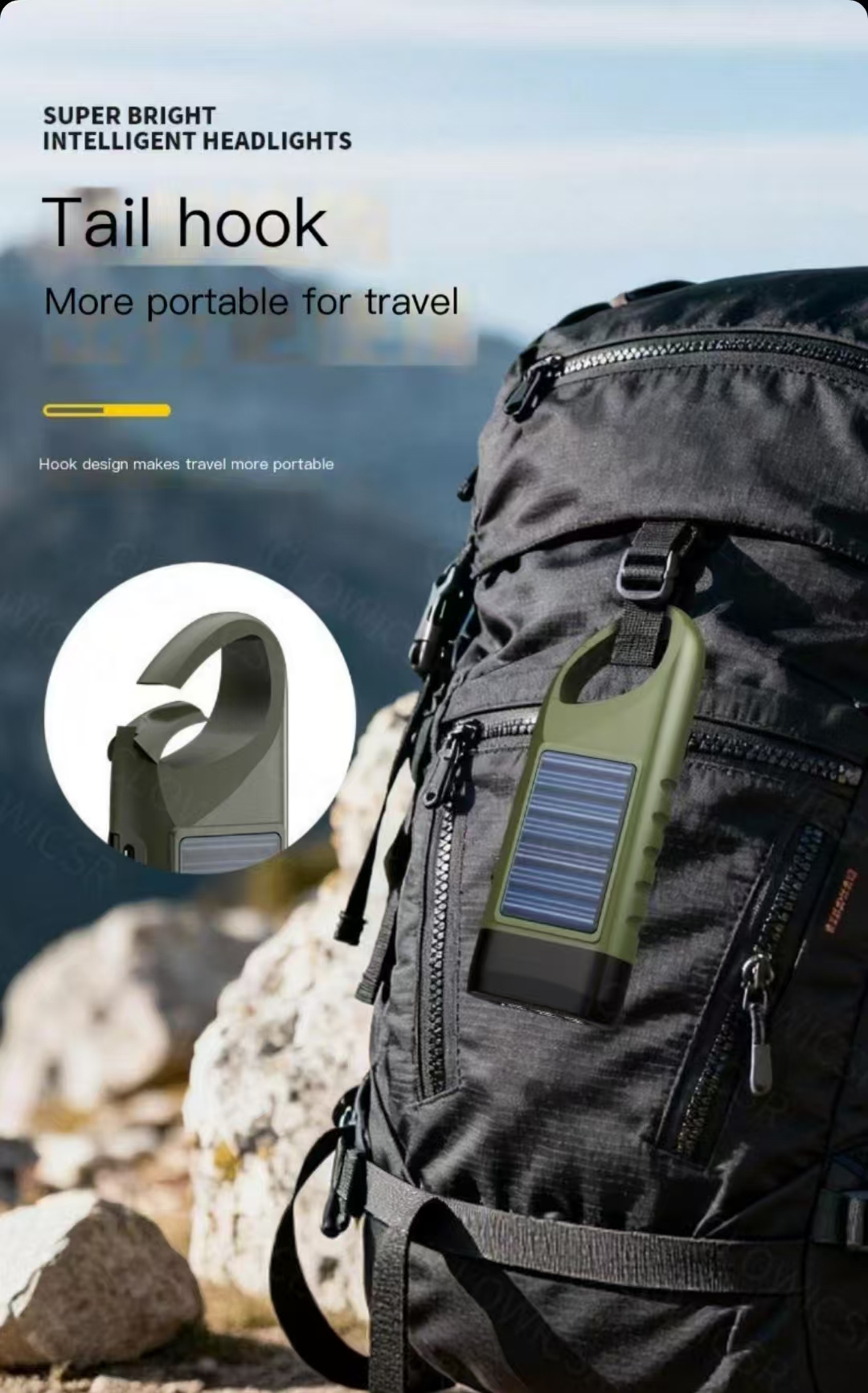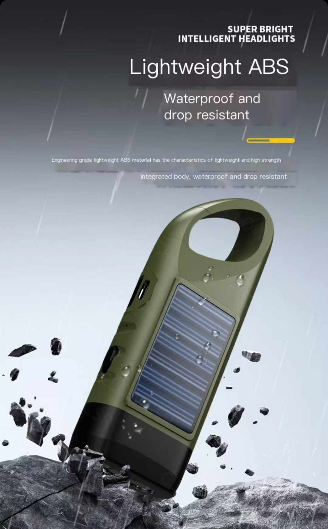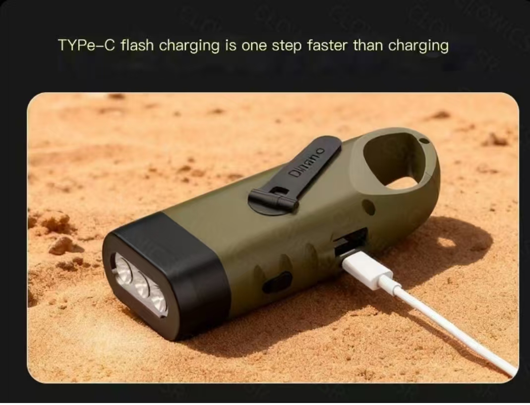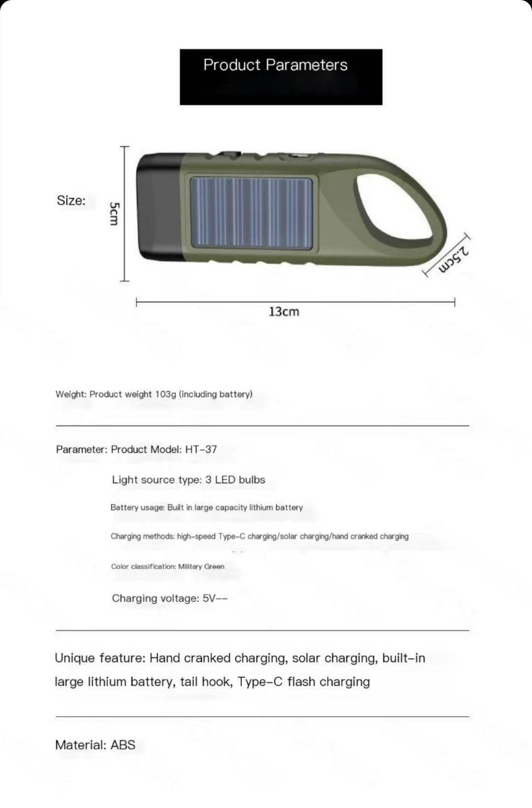 Product Parameters Size: 2.5cm 13cm Weight:Product weight 103g (including battery) Parameter:Product Model:HT-37 Light source type: 3 LED bulbs Battery usage:Bult in large capacity lthum battery Charging methods: high-speed Type-C charging/soler charging/hand crarked charging Coler classification Mlitary Creen Charging voltage:5V-- Unique feature:Hand cranked charging,solar charging,built-in large lithium battery,tail hook,Type-C flash charging Material:ABS
